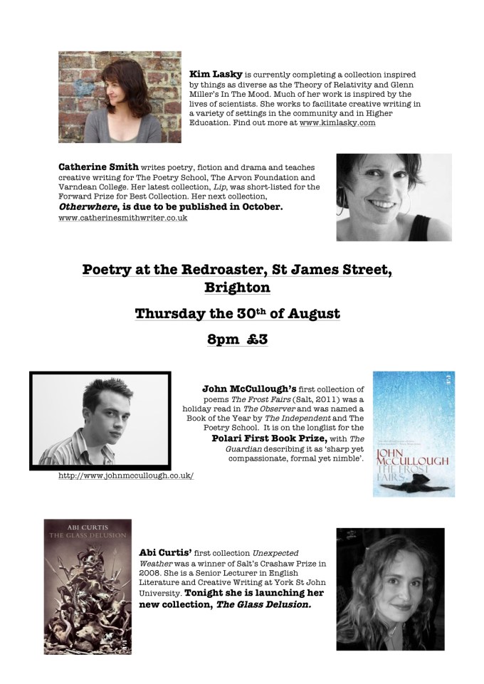 Thanks to everyone who made the reading at the Red Roaster such good fun. Wonderful readings by Catherine Smith, previewing poems from her new collection Otherwhere, due out next month, John McCullough reading from his brilliant debut collection The Frost Fairs, and Abi Curtis, back in Brighton to launch her beguiling new collection The Glass Delusion just published by Salt. We had a great evening!